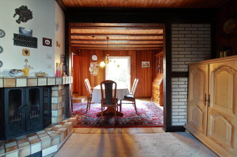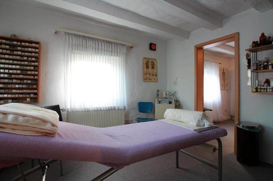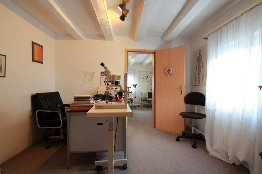 Beim Betreten des Hauses erhalten Sie schon einen ersten, charmanten Eindruck: die für Fachwerkhäuser üblichen niedrigen Decken vermitteln unmittelbar pure Gemütlichkeit, eine ebenfalls typische steile, schmale Stiege führt ins Obergeschoß. Linker Hand befinden sich die vormals als Praxis genutzten Räumlichkeiten (durch einen separaten Eingang zu betreten) mit sep. WC – warum nicht als Büro- oder Gästeräume nutzen? Rechts gelangen Sie in das Wohn-Ensemble Kamin-, Ess- und Wohnzimmer mit angeschlossener Küche. Angrenzend an das Wohnzimmer vermittelt ein kleiner Wintergarten noch zusätzliches "Draußen-Gefühl", vom Essbereich geht's direkt auf die großzügige, nach Westen ausgerichtete Terrasse mit dem angrenzenden, hier leicht abschüssigen Garten.