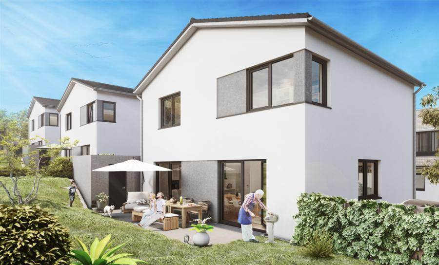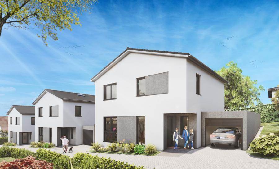 Das Einfamilienhaus mit wärmegedämmtem Satteldach befindet sich freistehend auf einem 315 m² großen Grundstück und verfügt über eine Einzelgarage, sowie einen Stellplatz. Die Fassade präsentiert sich Ihnen mit einem Edelstrukturputz in weiß und zum Boden hin ist sie mit einem dunkelgrauen Sockel versehen.