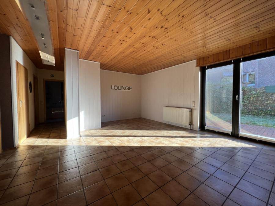 Im Erdgeschoss befindet sich der große und offenen Wohn- und Essbereich mit direktem Zugang in den Garten. Die eingerichtete Küche kann übernommen werden. Zwei weitere Zimmer, ein Badezimmer mit Badewanne und Dusche, sowie ein kleiner Abstellraum liegen ebenfalls im Erdgeschoss.