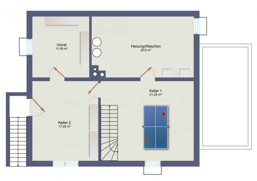 Das Untergeschoss mit separatem Eingang ist über eine Treppe links neben dem Haus zu erreichen. Hier befindet sich ein Badezimmer mit Dusche und Badewanne, zwei weitere Räume, sowie Anschlüsse für eine Küche.