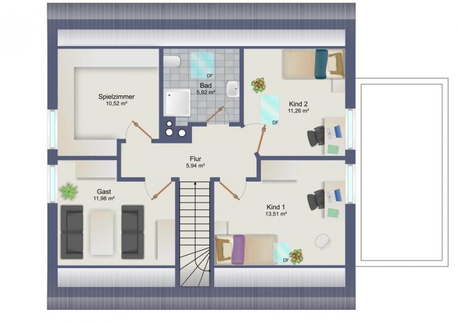 Über die Treppe, die sich im Eingangsbereich wiederfindet, gelangen Sie in das 1.OG. Hier befinden sich drei Schlafräume und ein weiteres Badezimmer mit Dusche.