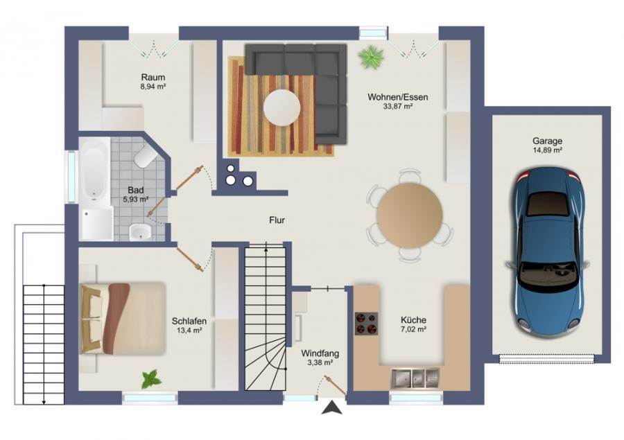 Zum Haus gehört eine Garage und ein Stellplatz.