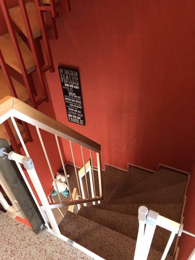 Das besondere ist der für Allergiker sehr geeignete Bodenbelag im ganzen Haus – das gesamte Treppenhaus (außer die letzte Steigung zum Dachgeschoss) und das gesamte Obergeschoss sind mit extrem haltbarem, pflegeleichten und TOP Allergiker geeignetem Steinteppich ausgelegt. Im Erdgeschoss sind die Diele, die Küche und das Gäste-WC gefliest und im Wohnzimmer ist ein Laminatboden ausgelegt. Der Keller ist bis auf den Hausanschluss-Waschraum ebenfalls gefliest.