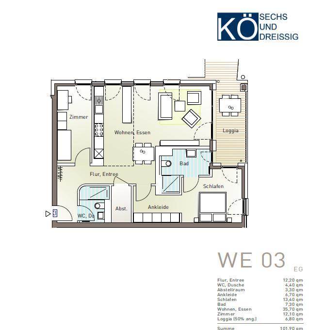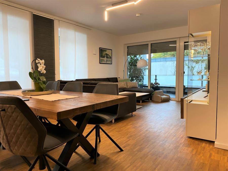 Von der Wohnungseingangstür aus gelangen Sie in das Entree, wo sich das Gäste-WC mit ebenerdiger Dusche befindet. Auf der linken Seite des Entrees ist das jetzige Kinderzimmer. Wenn Sie weiter dem Entree folgen haben sie zu ihrer rechten einen ca. 3 m² großen Hauswirtschaftsraum bis sich dann auf der linken Seite das offen gestaltete, lichtdurchflutete und großzügige Wohn- und Esszimmer mit offener Küche zeigt, von dem Sie auch einen Zugang zur Terrasse haben. Gegenüber vom Essbereich gelangen Sie ins wunderschöne Schlafzimmer mit Ankleidebereich. Der andere Zugang zur Terrasse ist hier erreichbar, sowie durch das vom Schlafzimmer direkt begehbare Hauptbadezimmer mit Dusche und WC.