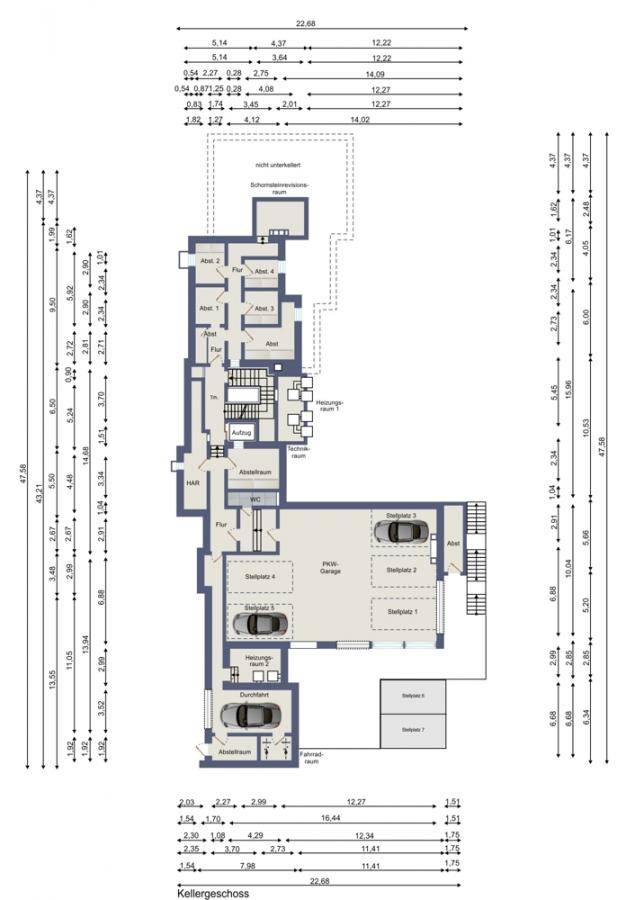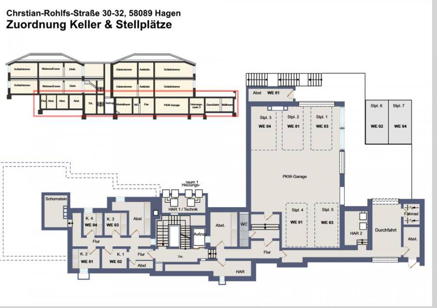 Im Kellergeschoss finden Sie den Gemeinschaftskeller, das Gäste-WC, einen Fahrradkeller und ein zur Wohnung gehörenden Kellerraum.