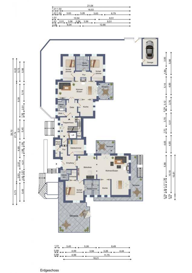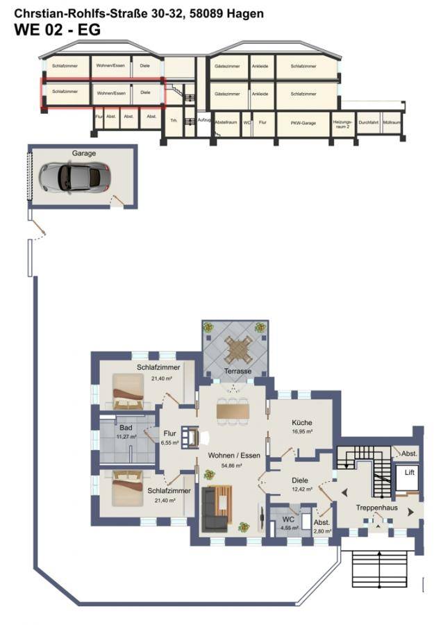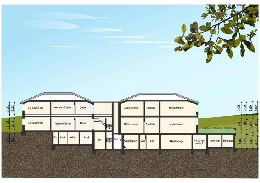 Durch die Tiefgarage direkt unter dem Haus, erreichen Sie diese große und komfortable Eigentumswohnung im Erdgeschoß links mit dem Aufzug. Der zur Wohneinheit gehörende Stellplatz und die freistehende Garage gehört ebenso wie der Garten zur Wohnung.