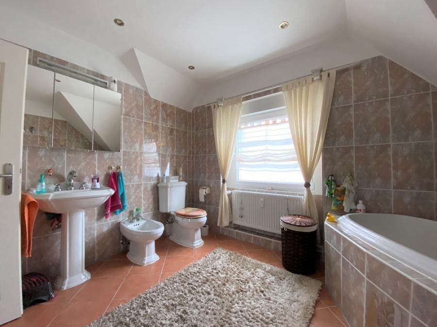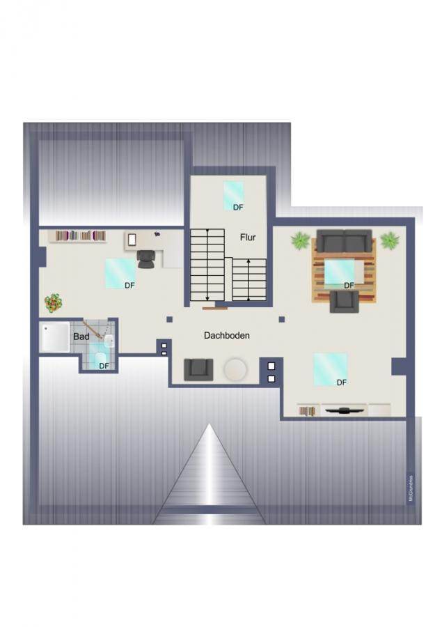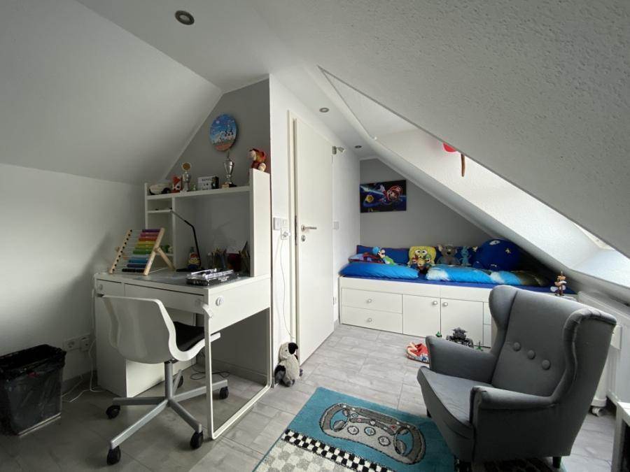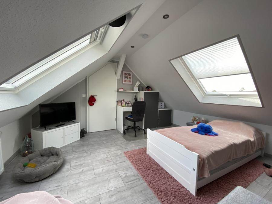 Im ausgebauten Dachgeschoss befinden sich ein Flur, von dem die beiden Kinderzimmer zu betreten sind. Außerdem befindet sich hier noch ein Tageslichtvollbad mit Dusche. Hier haben wir eine Grundfläche von ca. 50 m².