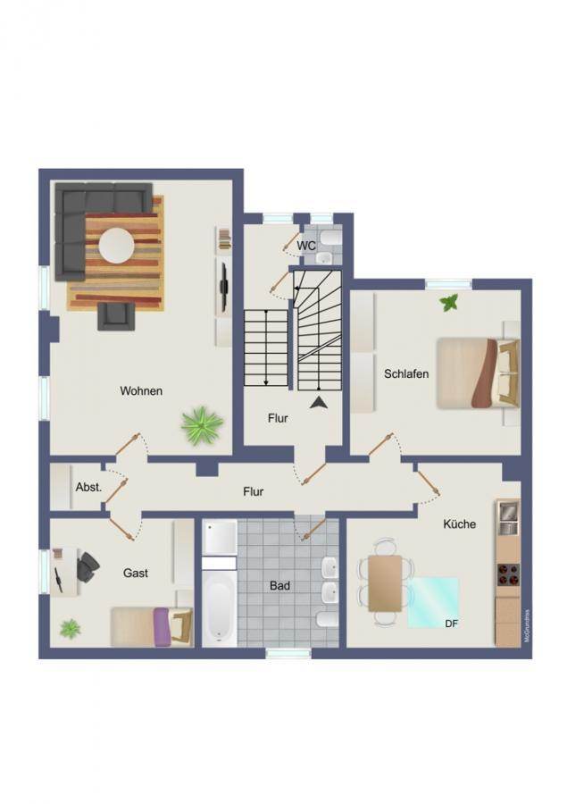 Von der geräumigen Diele im unteren Bereich sind alle Zimmer der Wohnung zu erreichen. Auf der linken Seite der Wohnungseingangstür befindet sich das großzügige Schlafzimmer mit ca. 25 m². Nebenliegend befindet sich die helle Küche mit ausreichend Platz für die gesamte Familie. Vom Flur aus erreichen Sie ebenfalls das großzügige Tageslichtvollbad mit Badewanne, Dusche und Bidet. Das Gästezimmer bietet mit seinen ca. 9 m² genügend Platz. Hier könnte auch ohne weiteres ein Arbeitszimmer entstehen. Gegenüberliegend ist das wunderschöne, mit liebevollen Details gestaltete Wohnzimmer, das durch einen hölzernen großzügigen Durchgang zu erreichen ist. Im Wohnzimmer befindet sich ein Kamin an dem Sie gemütliche Stunden verbringen können. Das 2. OG umfasst eine Wohnfläche von ca. 86 m².