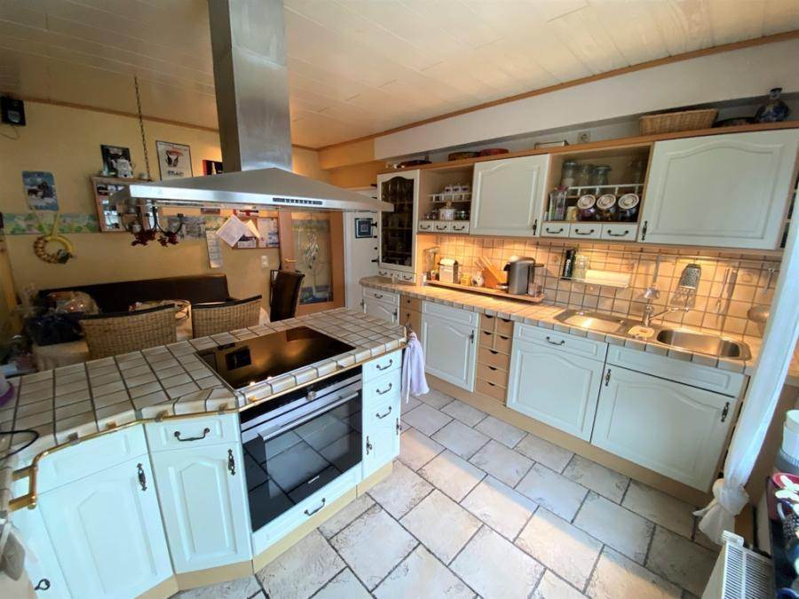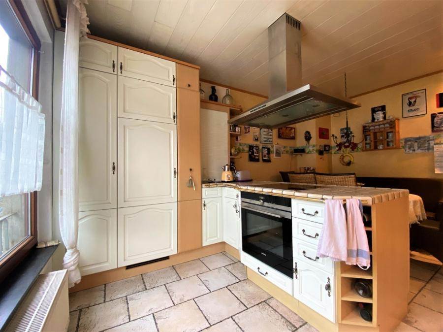 Gegenüber der Eingangstür am anderen Ende der Diele liegt die Küche mit Essplatz. Diese helle maßangefertigte Küche im Landhausstil bietet viel Platz für Stauraum und lädt dazu ein sein kulinarisches Talent auszuleben.