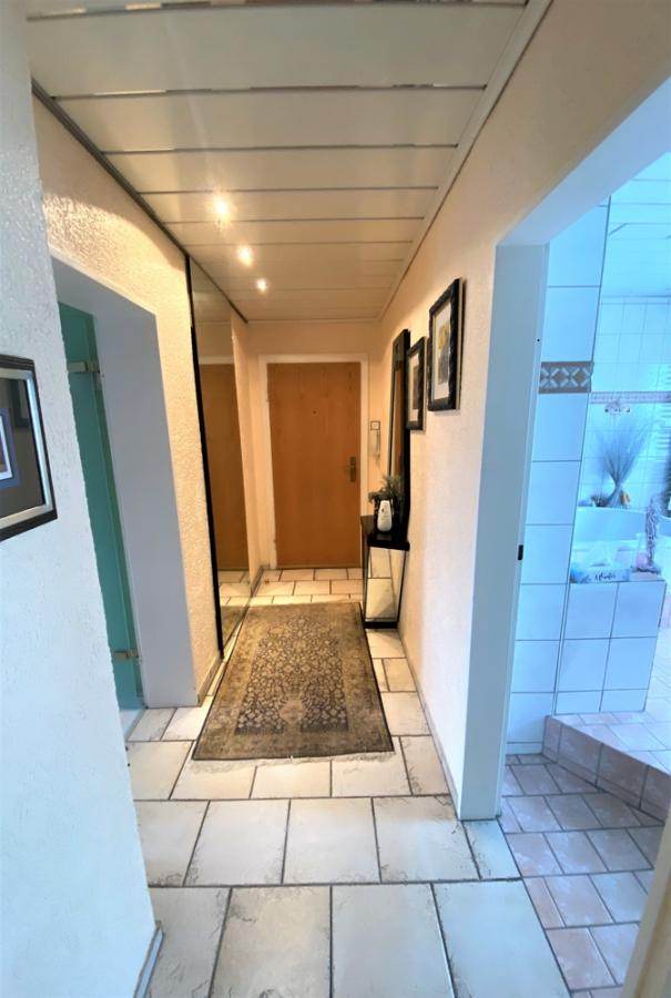 Gleich nach betreten der Wohnung stehen Sie in der hell gefliesten Diele. Rechts hinter einer großen Spiegel-Schiebetür versteckt sich eine geräumige Garderobe, die ausreichend Platz für Jacken und Schuhe bietet.