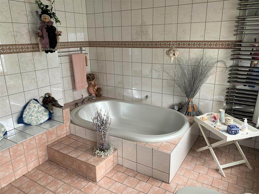 Auf der linken Seite gelangen Sie in das große, lichtdurchflutete Badezimmer. Darin befindet sich eine große Badewanne, mit angrenzender eingebauter Sitzbank, die für entspannende Bade Atmosphäre sorgt, sowie zwei Waschbecken und einer Toilette.