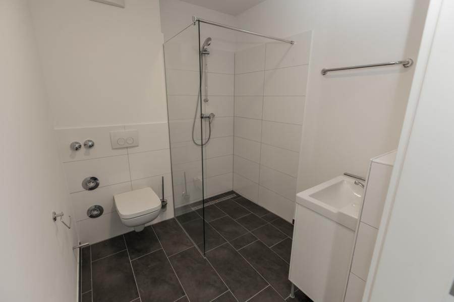 • Modernes Badezimmer mit bodengleicher Dusche, WC und Waschbecken