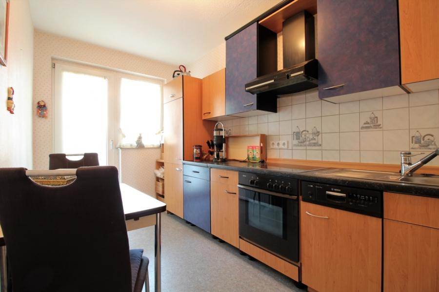Auf der rechten Seite des Flurs liegen ein Abstellraum, das innenliegende Wannenbad und ein separates WC, sowie die großzügige Küche. Auch diese hat noch einen Balkon, etwas kleiner und nördlich ausgerichtet.