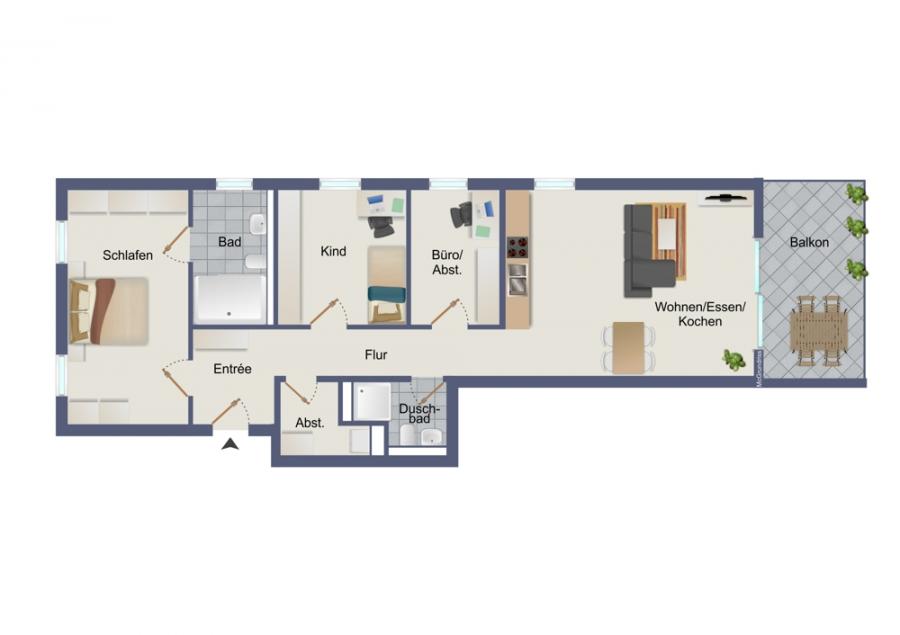 Auf rund 94 m² Wohnfläche erwartet Sie ein modernes Wohnkonzept mit vier hellen Zimmern, die hohen Wohnkomfort und vielfältige Nutzungsmöglichkeiten bieten. Der offene Wohn- und Essbereich mit integrierter Küche bildet das Herzstück der Wohnung und öffnet sich zum Balkon, der den Wohnraum harmonisch ins Freie erweitert.