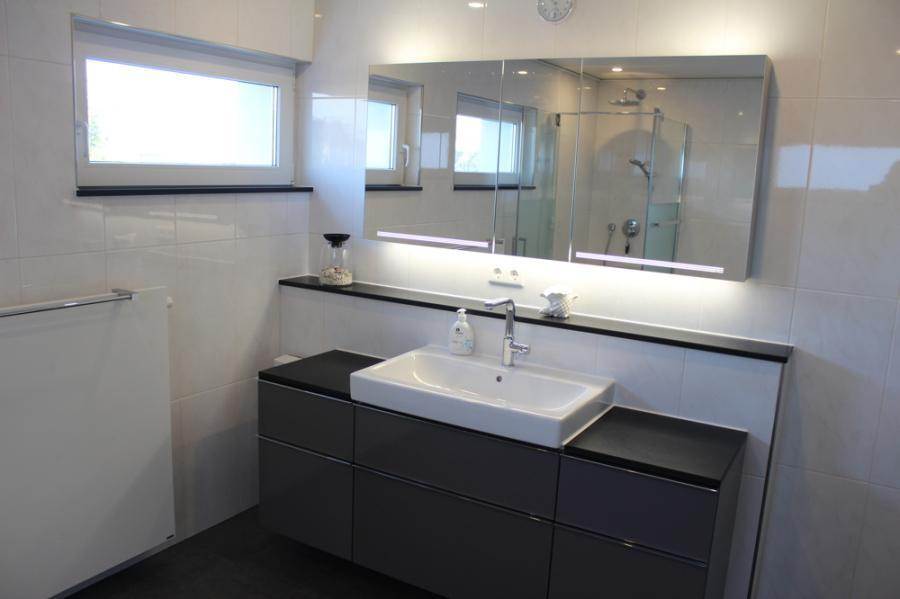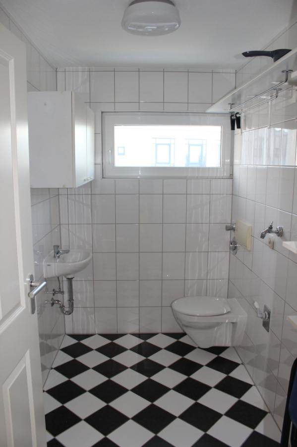 Bodenbeläge gefliest in Weiß, Schwarz und Grau und in vier Zimmern grauer Teppichboden