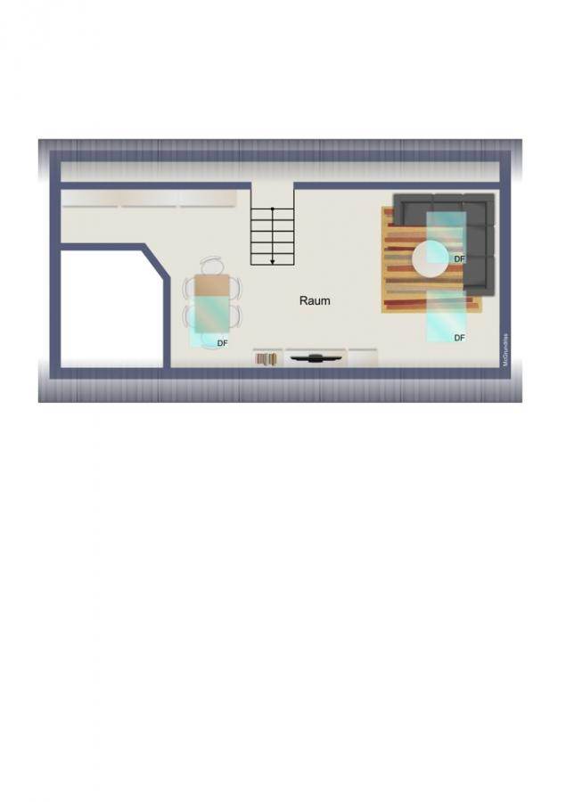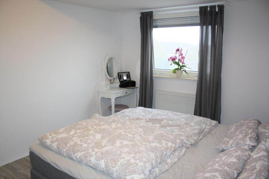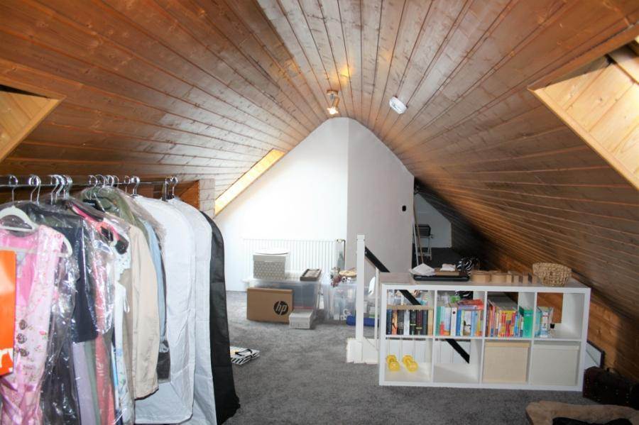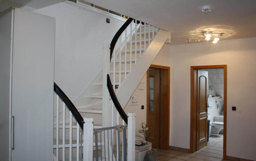 Auf der linken Seite befindet sich das Schlafzimmer. Direkt gegenüber ist der Treppenaufgang, wo Sie über eine gewendelte Holztreppe ins Obergeschoss gelangen. Hier bietet sich ausreichend Platz für ein Kinderzimmer oder die Nutzung eines Büroraumes.