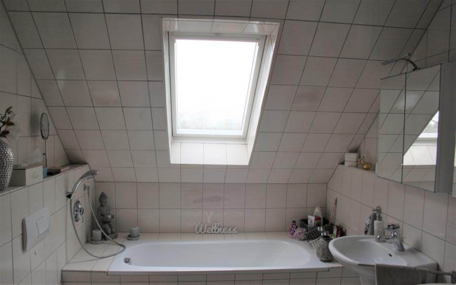 Von dem Eingangsbereich betreten Sie auf der rechten Seite das Badezimmer, welches in schlichtem weiß gehalten ist und über eine Badewanne, Dusche, zwei Waschbecken und WC verfügt.